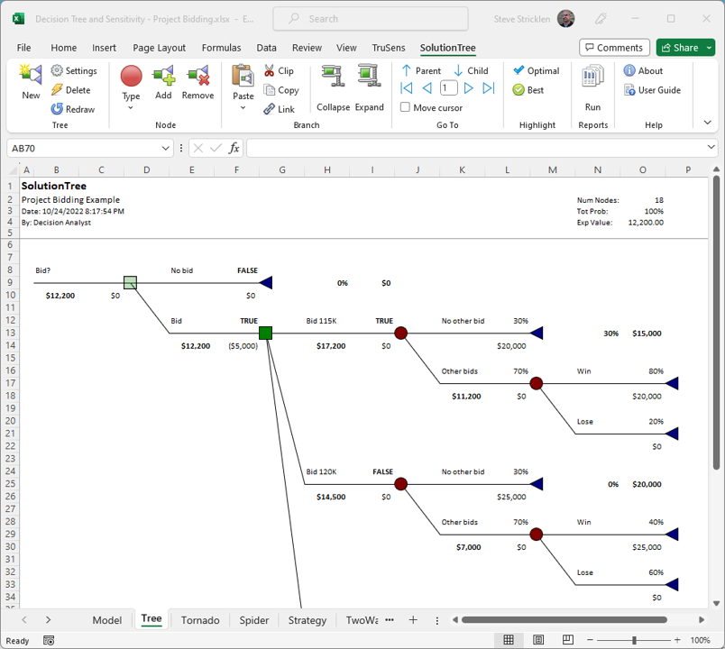 SolutionTree automatically calculates the optimal path through your decision tree. As you update the node values, the custom functions will determine the best alternatives by "folding back" the optimum expected value for the entire decision tree. Decision analysis doesn't get any easier than this.